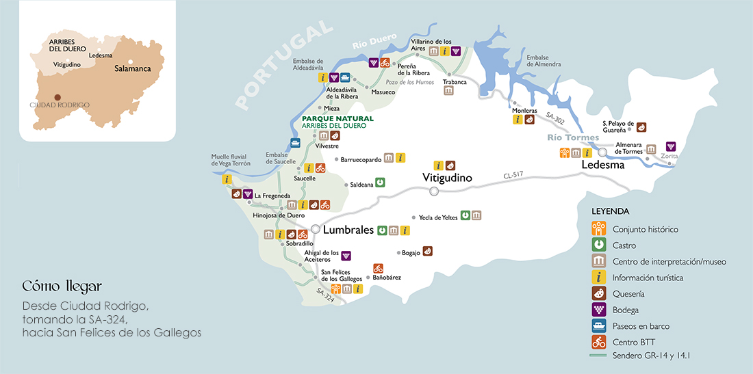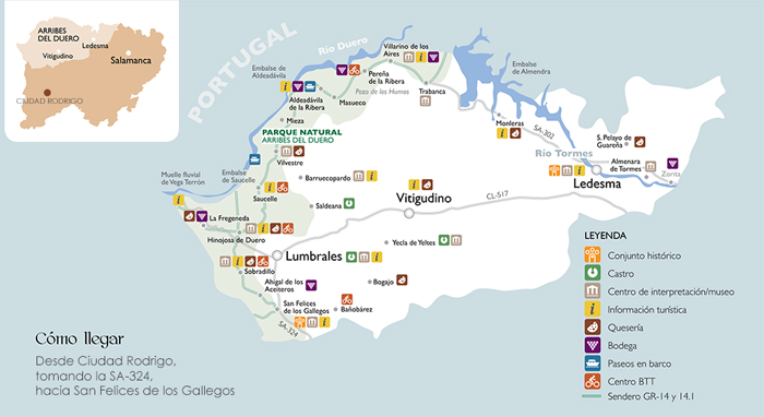 Actividades: Las excursiones, el senderismo, el turismo rural o la fotografía son algunas de las actividades que se pueden practicar en la zona. Pero sobre todas, sobresalen la caza menor, abundantísima en conejos, liebres, perdices y tórtolas; y la pesca en los embalses de Almendra (carpas y black-bass), Aldeadávila y Saucelle (barbos, bogas, carpas y anguilas) y en los ríos Uces y Camaces (cangrejo y sardas) y Huebra y Águeda (barbos, bogas y anguilas).