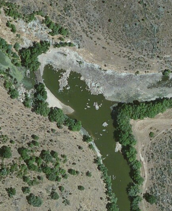 la confluencia de ambos ríos: el Huebra es la corriente que llega desde la derecha y el Yeltes la que lo hace por la parte inferior. Se observa la presa construida justo en dicha confluencia, parcialmente destruida en la orilla izquierda, por donde llega el caudal del río Yeltes.