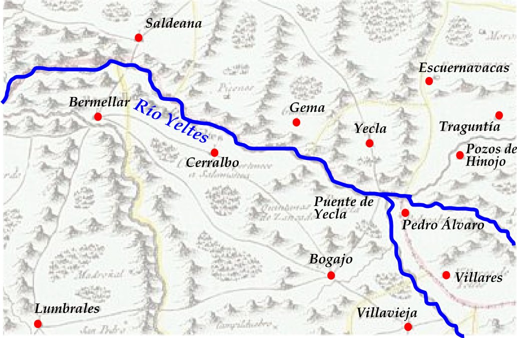 Yecla: "Este pueblo es limítrofe del partido y obispado de Ciudad Rodrigo, cuya separación la forma el río Yeltes, que ya lleva reunido el caudal del Huebra, sobre el cual tenía un sólido puente, que fue arruinado en la guerra de la independencia".