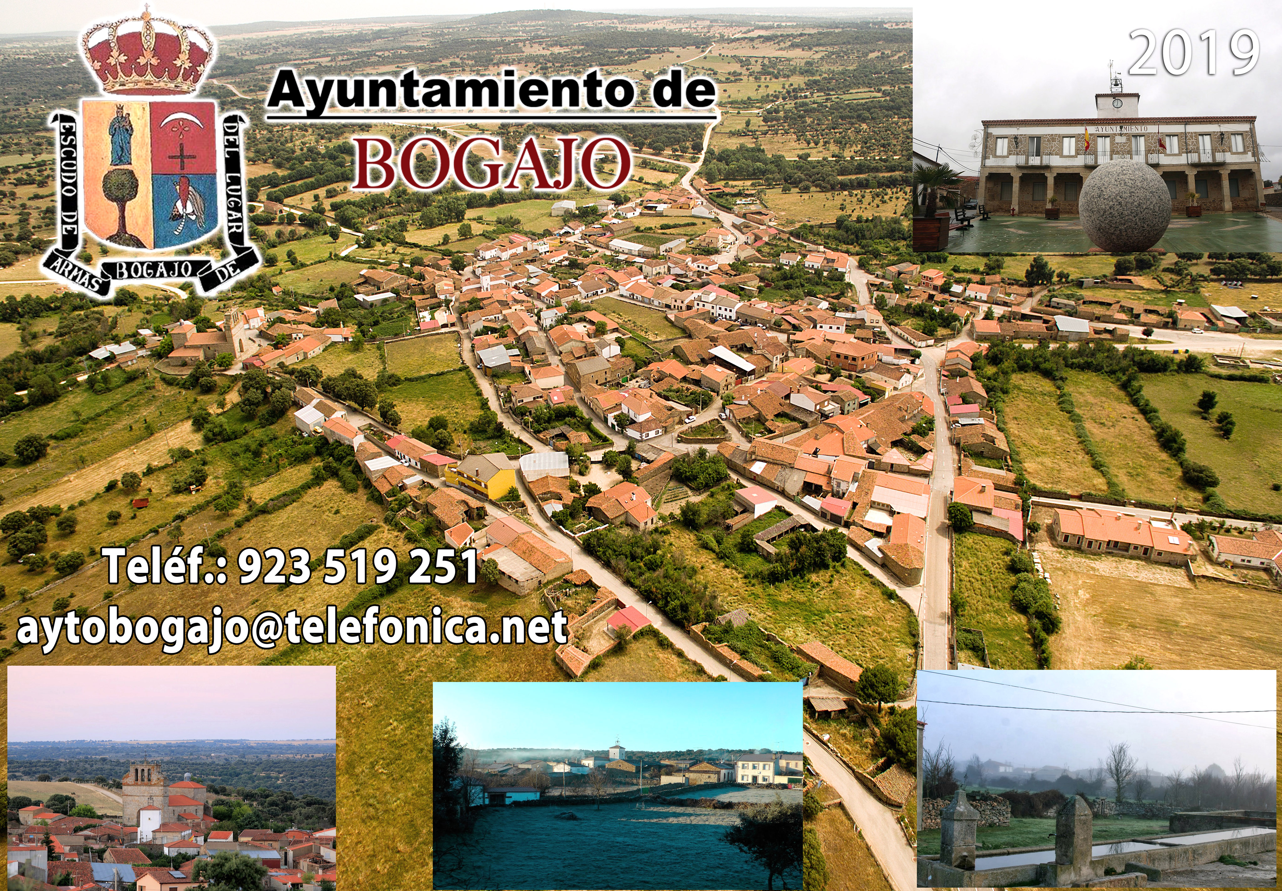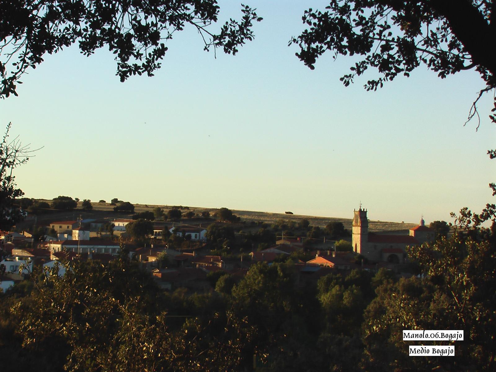 Durante la grabación de dicho vídeo Jaime capturó distintas fotografías que puedes ver aquí: La siguiente imagen es un montaje realizado por el fotógrafo salmantino Ángel García para ilustrar el calendario de 2019 que publicó el ayuntamiento. En dicha imagen podemos ver de fondo una vista aérea de Bogajo sacada desde el extremo norte del núcleo urbano, que podrás observar detalladamente al pinchar sobre ella, ya que se abrirá ampliada en una nueva ventana. Las siguientes fotografías están sacadas desde distintos puntos de las afueras de Bogajo: En las tres primeras fotos se puede la silueta del conjunto de casas que forman el pueblo, en la que destacan las construcciones más importantes, como son la Iglesia o el Ayuntamiento. En la tercera imagen, sacada desde el Sierrito, se puede apreciar mejor el tamaño del municipio, al definirse mejor la distancia entre ambas edificaciones. Las dos siguientes están hechas desde la entrada del pueblo según se viene de Salamanca, justo al lado del cementerio. Pero, desde luego, la vista es mucho mejor desde al lado del depósito, que está situado a la salida del pueblo en dirección a Villavieja, y que es desde donde están realizadas las otras dos siguientes fotos. Y ya para terminar, en la última imagen se ve una panorámica del pueblo sacada desde los Gejos.